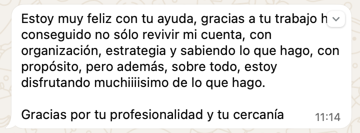 Si sigues la hoja de ruta acordada y completas las acciones clave definidas en tu plan, tienes asegurado acompañamiento y revisión estratégica durante el programa para ajustar lo necesario y evitar avanzar a ciegas.
